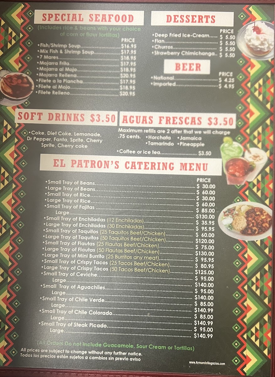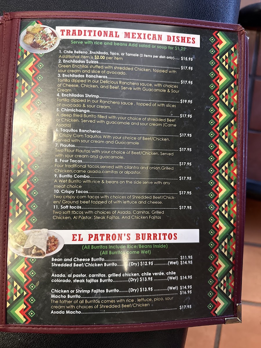 El Patron Family Restaurant offers a menu rooted in traditional Mexican flavors, designed for casual family dining and everyday enjoyment. Whether you’re settling in for a relaxed lunch or gathering for a lively dinner, the dishes invite a warm, familiar atmosphere where comfort and flavor take center stage.